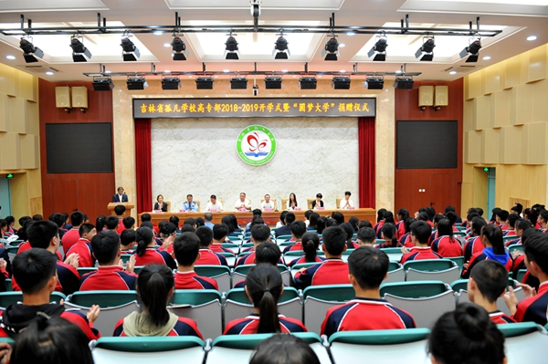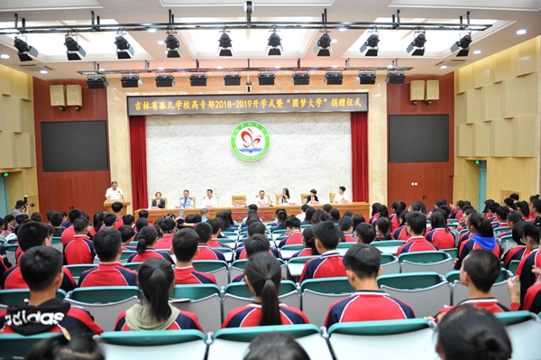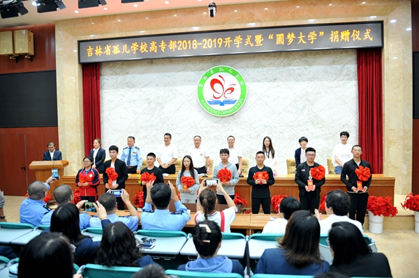 值此金秋硕果收获的时节,我校高专部召开了2018---2019学年度开学典礼暨“圆梦大学”捐赠仪式。吉林省慈善总会秘书长王志勇同志、国信慈善基金会总经理卢立章先生、大爱传媒集团总经理郭鑫女士、精英车队袁辉队长等爱心人士参加了仪式并为考上大学的孩子们送上奖励基金。学校领导班子及高专部全体师生近200多人参会。