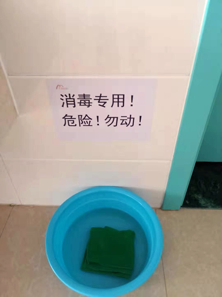 物业保洁每天对校园垃圾箱及各单体楼公共区域卫生进行清理,对室外各垃圾箱和各单体楼内墙角、地面、走廊、卫生间、洗漱间公共部位,每天上午、下午各一次用1:90的84配比溶液利用喷雾器进行喷洒消杀,每天4次对进出门把手用75%的酒精进行喷洒消杀,错开时间每天4次用1:180的84配比溶液将抹布侵泡30分钟后,对卫生间门、窗台、楼梯扶手进行擦拭,填写消毒记录。