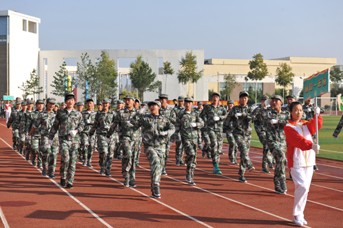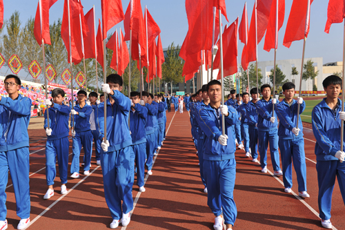 首先进行的是检阅式,国旗、校旗、鼓乐队、刀旗队、各班级、各职工队伍迈着整齐的步伐,喊着嘹亮的口号相继通过主席台,接受大会领导组和全校师生的检阅,全面展示了我校师生的精神风貌。